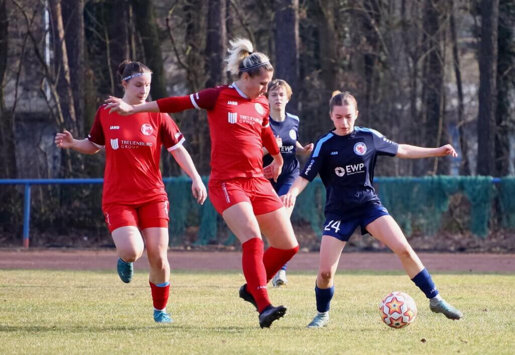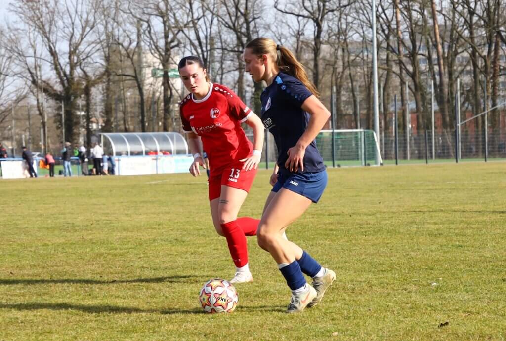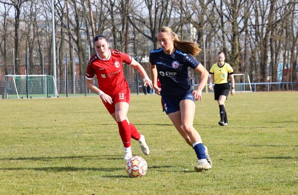 Gut von den Trainern eingestellt ging es auf den Rasen – und die Mannschaft setzte den Plan direkt um. Bereits in der 9. Spielminute traf Hanna Schütz nach einem zielstrebigen Dribbling zum 1:0. Nur zwei Minuten später erhöhte Charlotte Niedbal auf 2:0 (11.), nachdem sie sich mit großem Willen gegen Verteidigerin und Torhüterin der Gastgeberinnen durchgesetzt hatte.