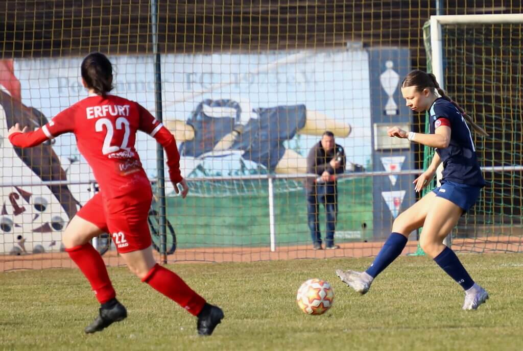 In dieser Phase erhöhte Erfurt mit einem Weitschuss auf 0:2. Danach entwickelte sich erneut ein Spiel mit vielen Ballwechseln, ohne große Torchancen für unsere Mannschaft. Erst kurz vor Schluss kombinierten sich unsere Mädels noch einmal sehenswert nach vorne, doch der Pfosten verhinderte den möglichen Anschlusstreffer.