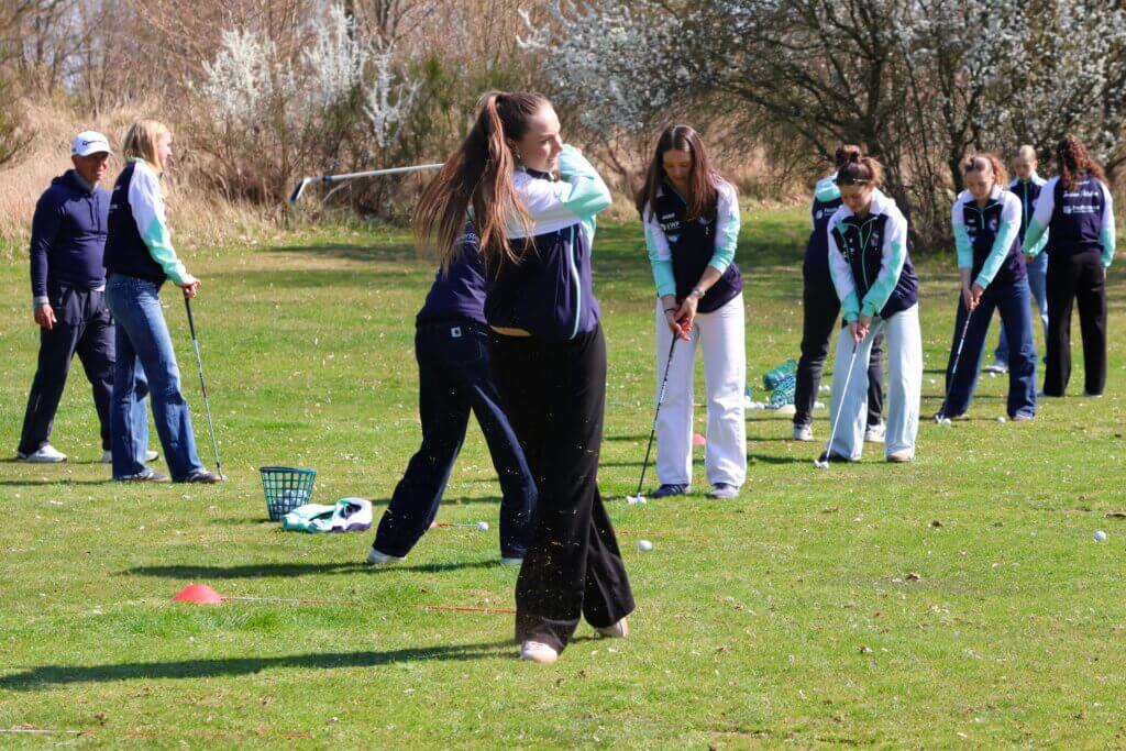 Am frühen Nachmittag stieß die gesamte Mannschaft sowie das Trainerteam dazu, um gemeinsam das Teamevent in Form eines eigenen Golfkurses zu bestreiten. Auch hier standen der Spaß und das Miteinander klar im Vordergrund, bevor es im Anschluss zur gemeinsamen Siegerehrung in das Clubhaus ging. Die Spielerinnen unterstützten dabei aktiv die Übergabe der Preise und sorgten für einen gelungenen Abschluss des sportlichen Teils.